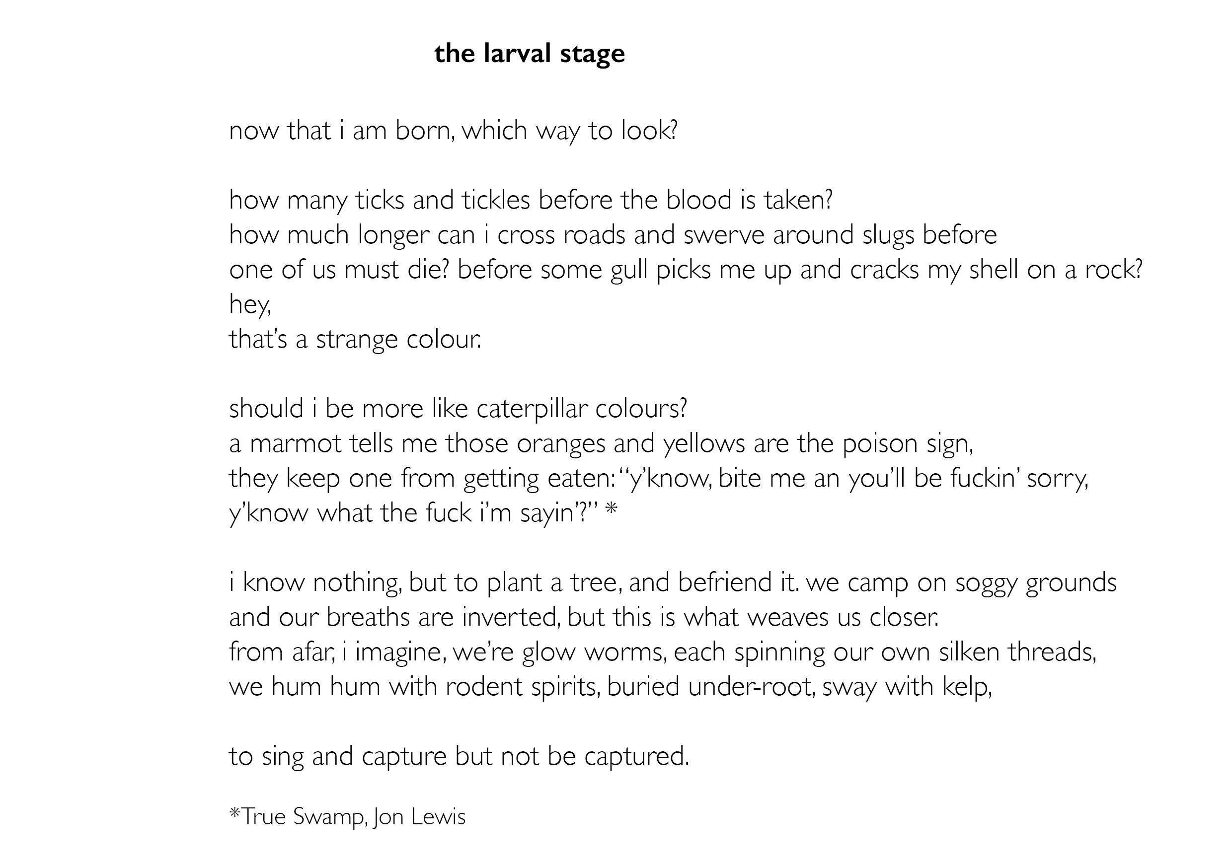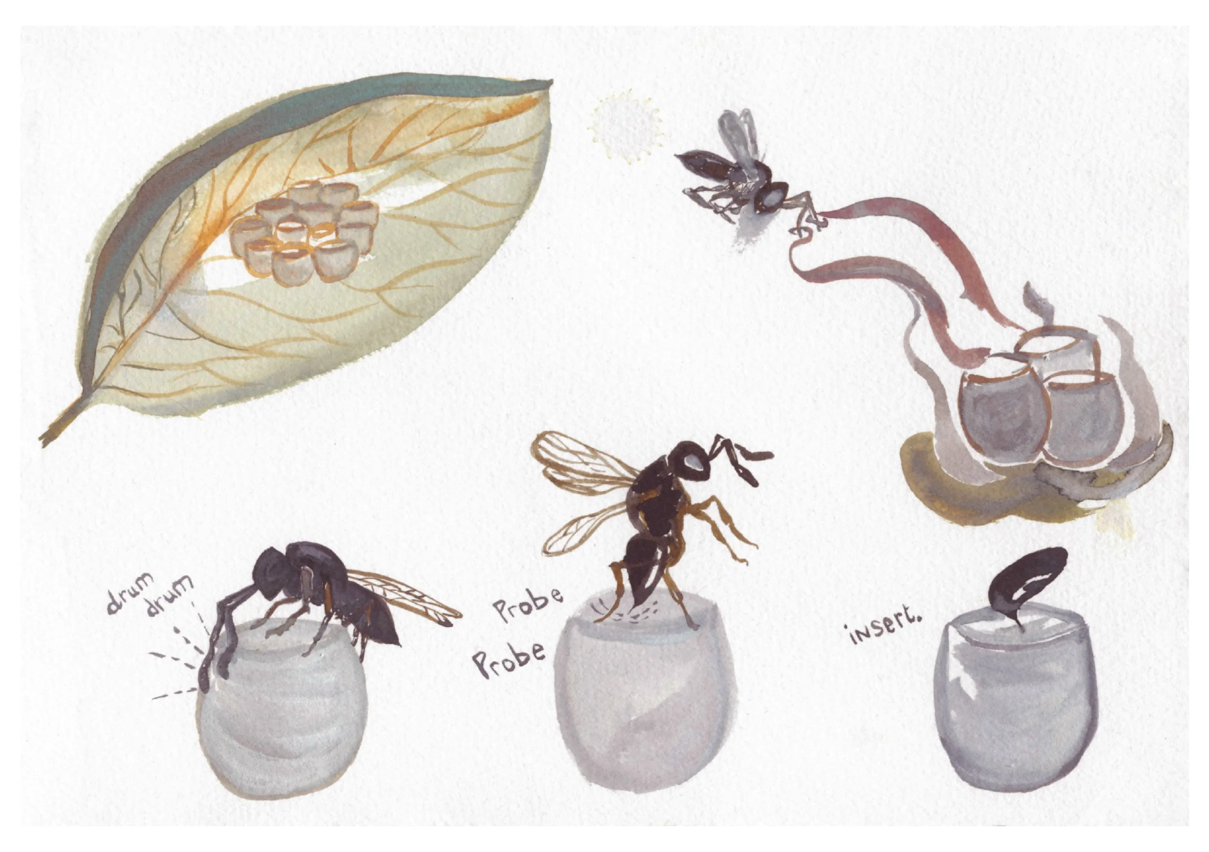 I am interested in interspecies communication and response, and how senses fuel the imagination. My work is a mix of curiosity and endless not-knowing; of play and the serious. Insects, parasites, fungi, and plants—I wish to contribute to a broader recognition of creatures in all shapes and sizes, not just for their ecological importance, but also as lively, aware, and full of story, and for whom things matter.