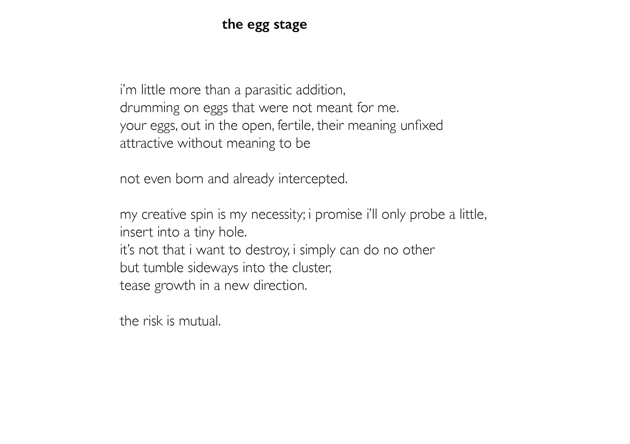 There is strange beauty, meaning, and creativity propelled into new forms by parasitic interceptions. I view humans and nonhumans as lively people, and blend identities with a touch of absurdity, as we shift each other’s value and meaning. This is not about harmonious or monstrous cohabiting, but dynamic inbetween places—shadow places and tricksters that linger at the edges of awareness, yet ask of us to reconsider common values. Nature is not a backdrop to human life. There is a place for laughter and awe amidst the disgust. There is growth with the rot. A spark of imagination through an unexpected encounter. Small creatures are a lot more intelligent, sensitive, and flexible than usually given credit for. Entangled and often ironic, we must keep finding arrangements to live together.